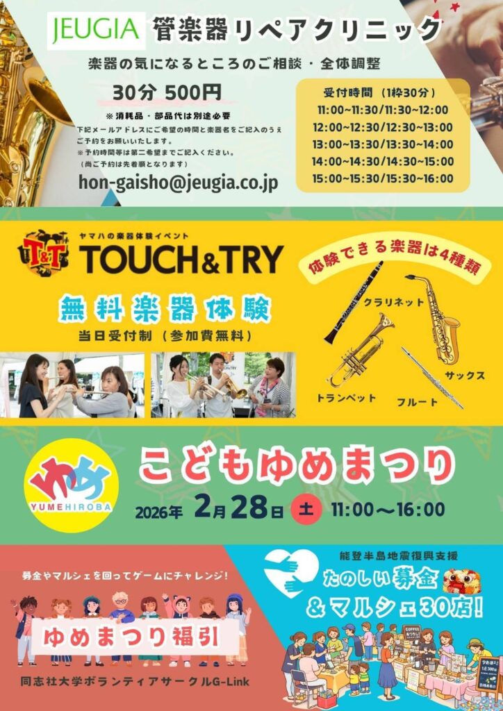 楽器体験やワークショップ、飲食ブース、縁日コーナーなど、